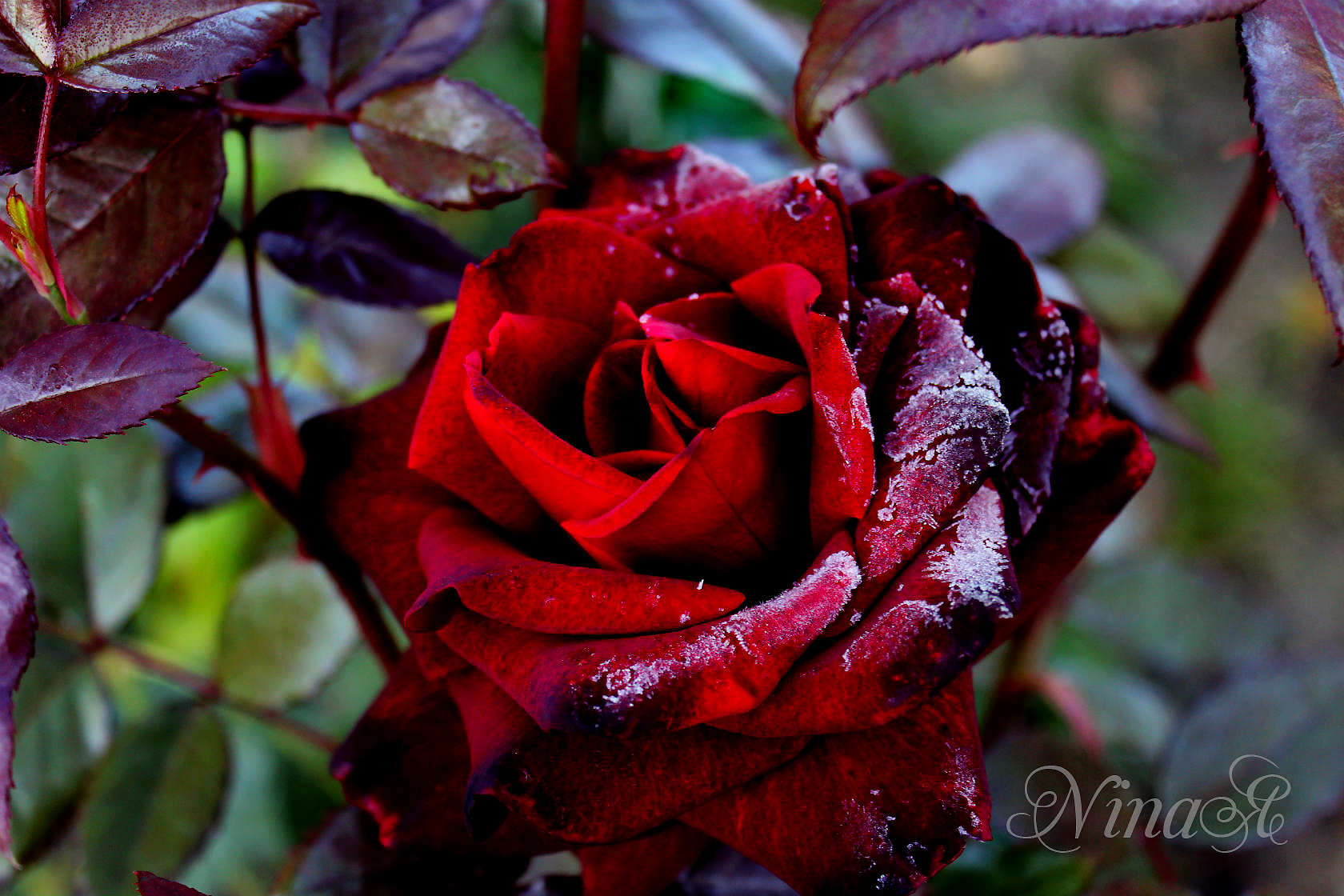 Чорна магія - таємничий і оксамитовий скарб клумби... У нас вона одна з перших,виростила з черенка (букета 8 Березня),а потім ще купила...і ще...Радує цвітінням з весни і до осені.Настали холоди і легкі морози ночами вже не рідкість, а троянди цвітуть і цвітуть.(і по правилам агротехніки уже пора їм дати спокій,і це грубі помилки, але ще помилуватися хочеться (знаю що наступної весни буде все гаразд)....така ось чудова квітка. А я продовжую писати короткі відгуки про троянди, короткі, тому що про троянди потрібно не читати, трояндами потрібно милуватися! Менше слів, більше фото...Ось фото нашої троянди в інеєві першого приморозку.