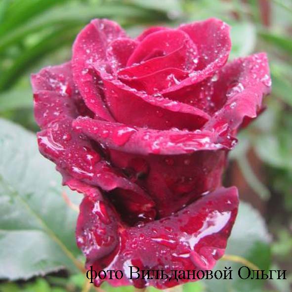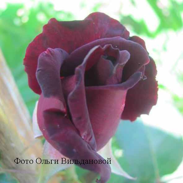 Квітка насиченого темно-бордового кольору, 12 см в діаметрі. Довго зберігає свою форму на кущі. Аромат легкий. Заслуговує на одне з перших місць у кожному саді.