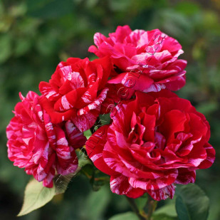 Его цветки классической формы, достаточно крупные (около 10 см.), густомахровые сочетают в себе два цвета: насыщенный красный и нежный белый с легким розовым отливом. Можно долго спорить какого цвета полоски на каком фоне – красные на белом либо белые на красном, но исходя из того, что на протяжении сезона в цветках преобладает то красный, то белый, да и на одном кусте могут зацветать почти красные рядом с практически белыми цветками, сделаем вывод, что полоски – штрихи – точки в этом сорте величина не постоянная и найти двух одинаковых цветков, вряд ли представится возможным.